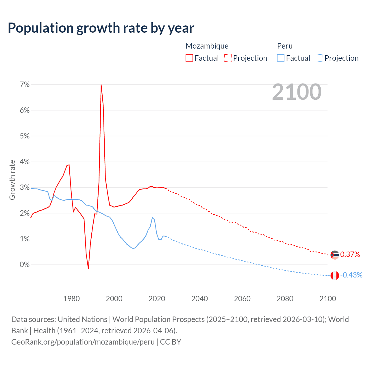 - For the last 10 years, Mozambique has had an average growth rate of +2.99% per year vs +1.26% in Peru.