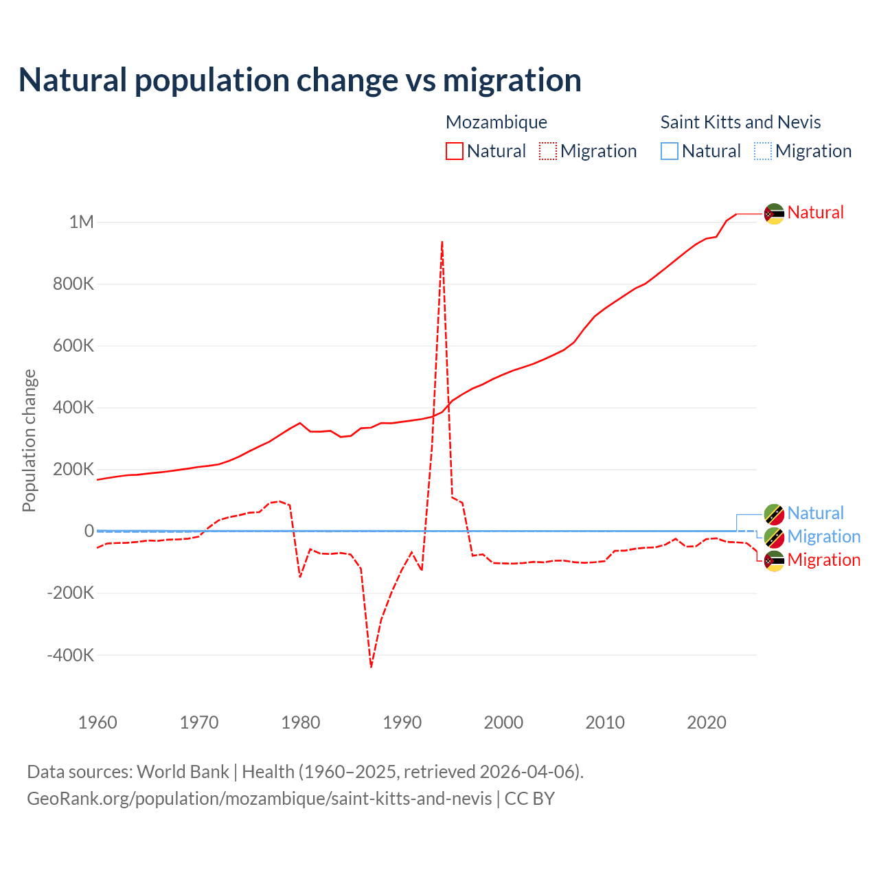 Over the last 10 years, 95.9% of the population change in Mozambique is from natural causes (a gain of 9,108,203 people) and 4.15% is from migration (a loss of 393,923 people). In Saint Kitts and Nevis 44.9% is from natural causes (a gain of 1,225 people) and 55.1% is from migration (a loss of 1,506 people).