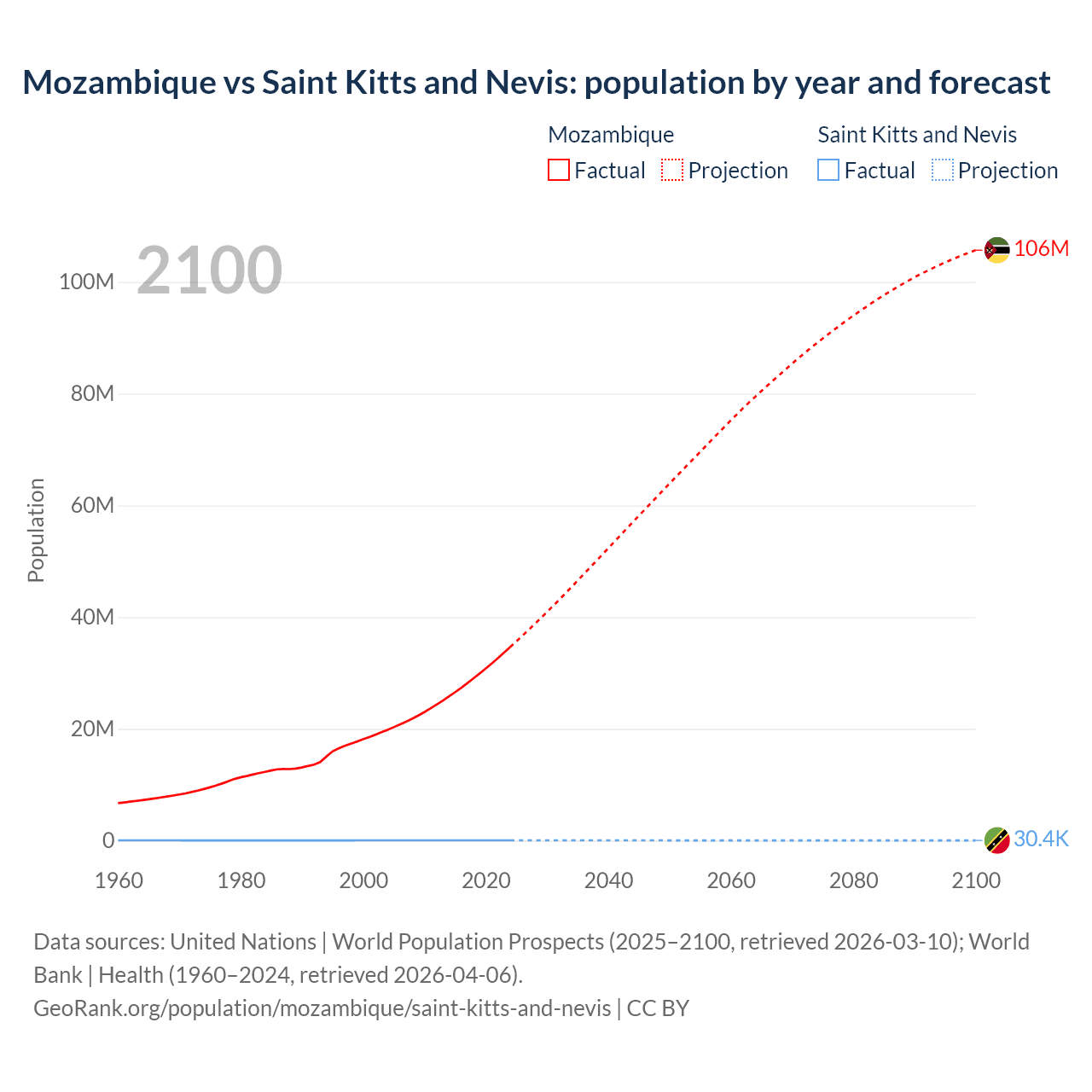 The latest officially reported population of Mozambique was 34,631,766 in 2024 vs 46,843 people in Saint Kitts and Nevis in 2024. In 2026, based on the adjusted UN estimation, the current Mozambique's population is 36,941,128 people compared to 47,017 in Saint Kitts and Nevis.
