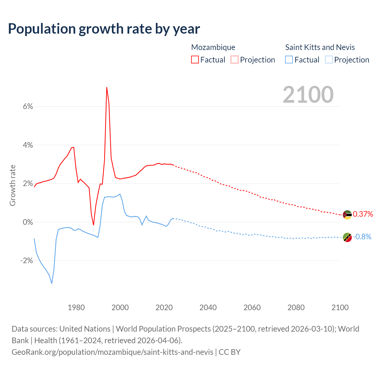- For the last 10 years, Mozambique has had an average growth rate of +2.99% per year vs -0.04% in Saint Kitts and Nevis.