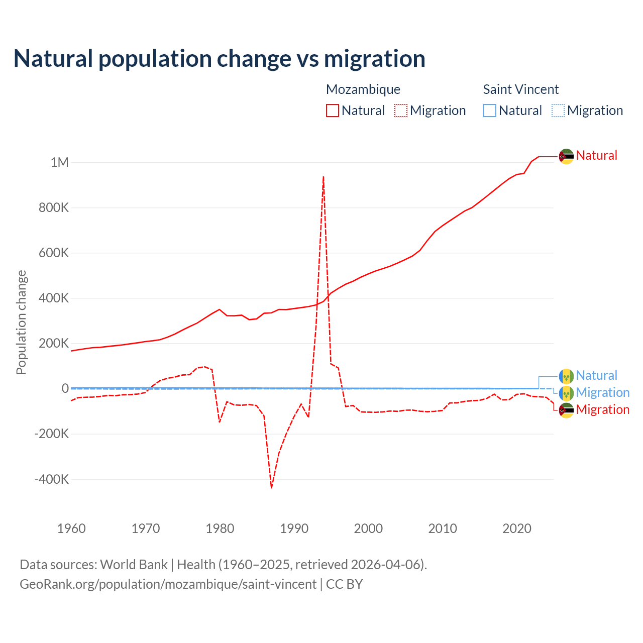Over the last 10 years, 95.9% of the population change in Mozambique is from natural causes (a gain of 9,108,203 people) and 4.15% is from migration (a loss of 393,923 people). In Saint Vincent 21.2% is from natural causes (a gain of 2,525 people) and 78.8% is from migration (a loss of 9,393 people).