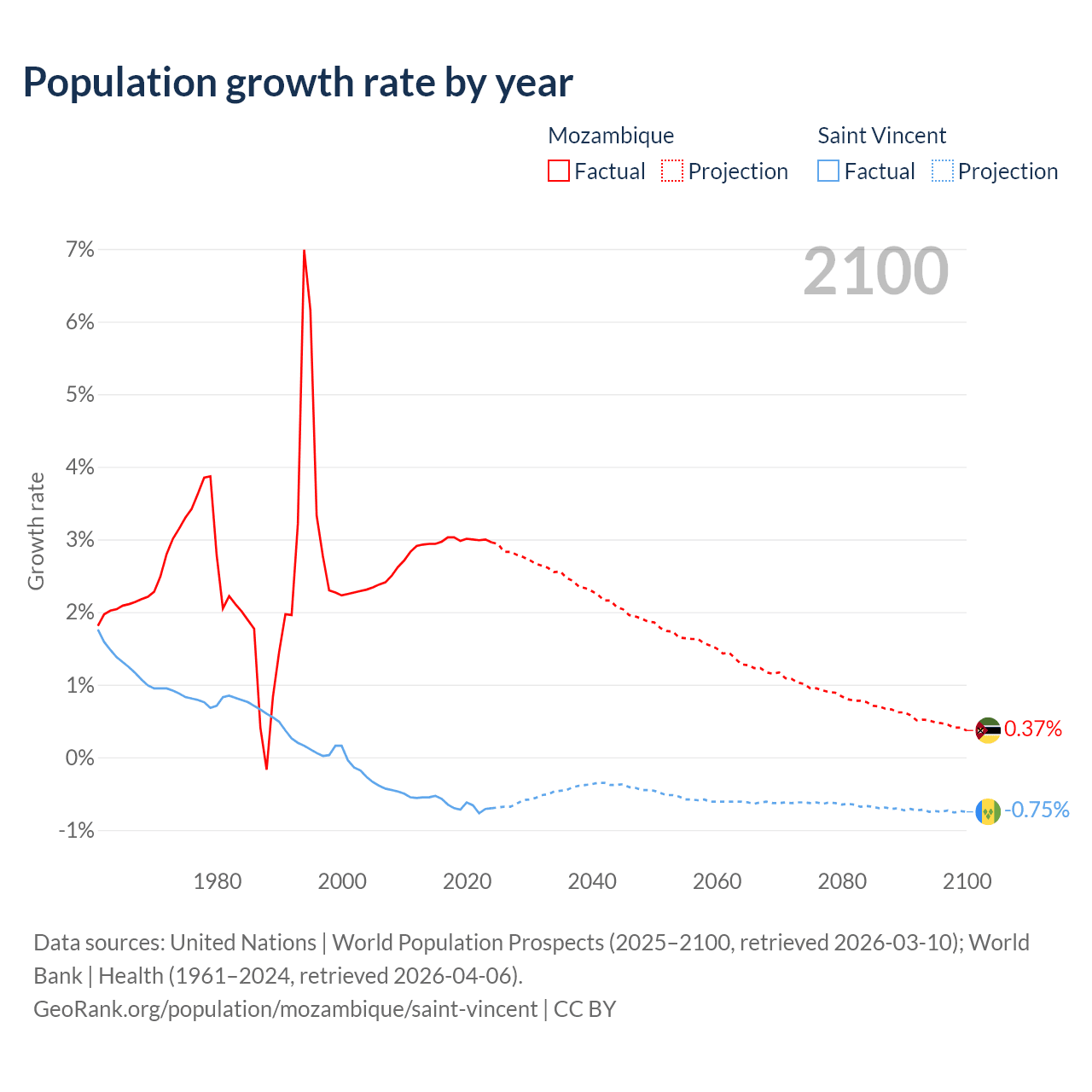 - For the last 10 years, Mozambique has had an average growth rate of +2.99% per year vs -0.65% in Saint Vincent.