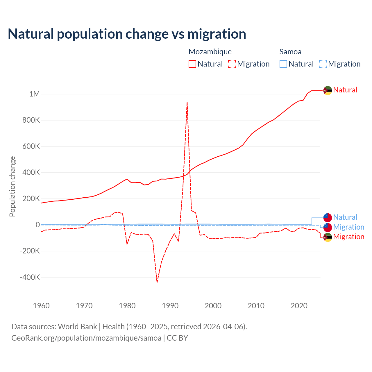 Over the last 10 years, 95.9% of the population change in Mozambique is from natural causes (a gain of 9,108,203 people) and 4.15% is from migration (a loss of 393,923 people). In Samoa 62.5% is from natural causes (a gain of 45,436 people) and 37.5% is from migration (a loss of 27,246 people).