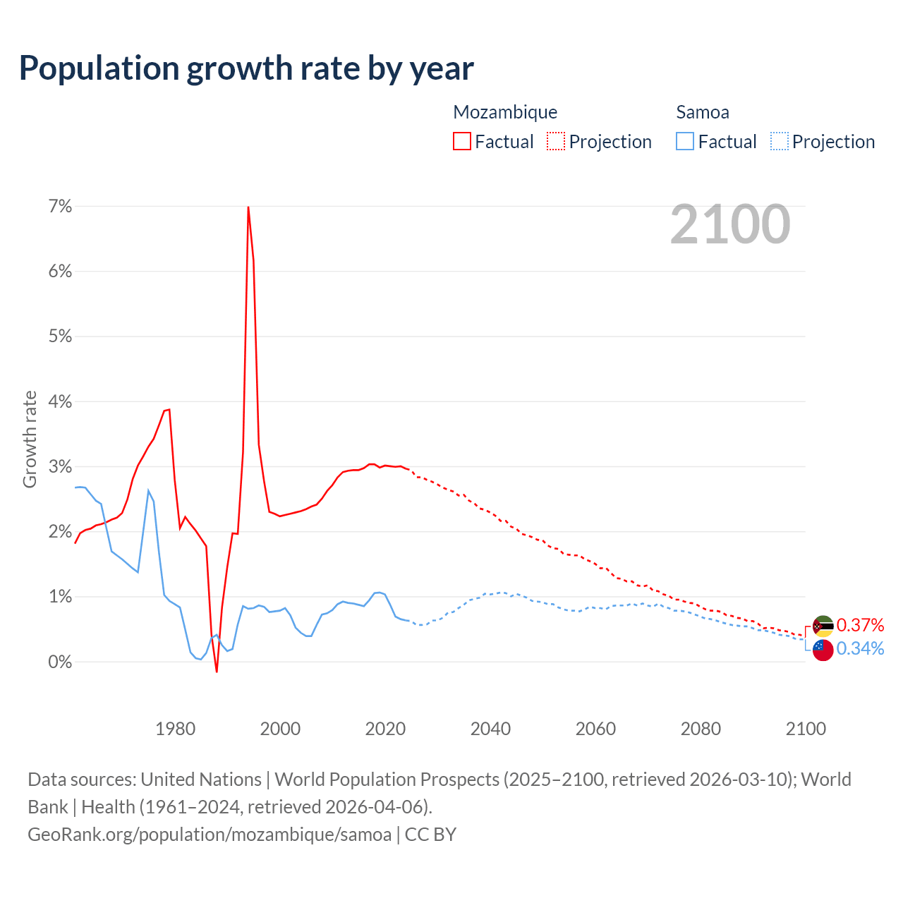 - For the last 10 years, Mozambique has had an average growth rate of +2.99% per year vs +0.87% in Samoa.