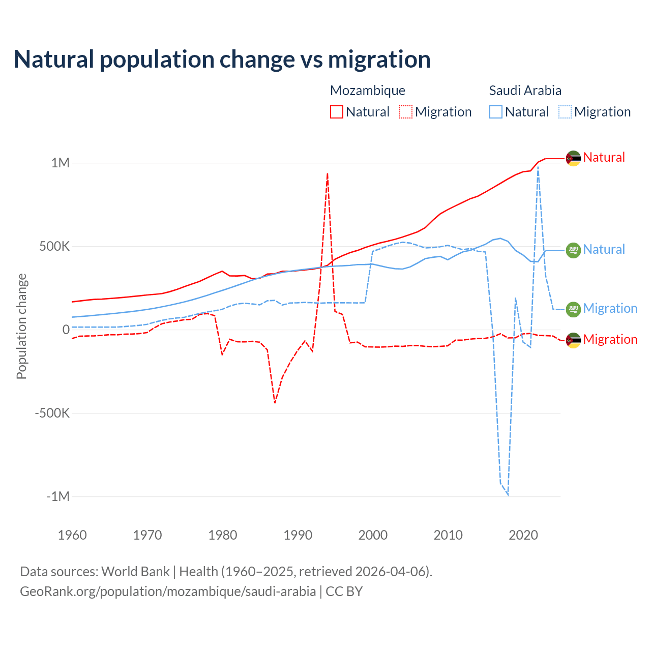 Over the last 10 years, 95.9% of the population change in Mozambique is from natural causes (a gain of 9,108,203 people) and 4.15% is from migration (a loss of 393,923 people). In Saudi Arabia 93.9% is from natural causes (a gain of 4,829,562 people) and 6.05% is from migration (a gain of 311,209 people).