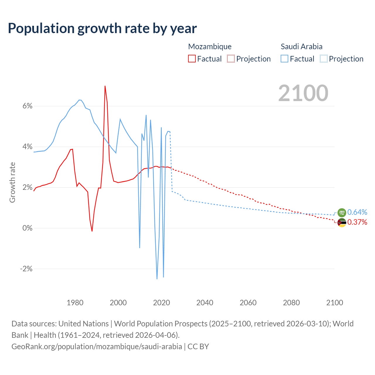 - For the last 10 years, Mozambique has had an average growth rate of +2.99% per year vs +2.3% in Saudi Arabia.