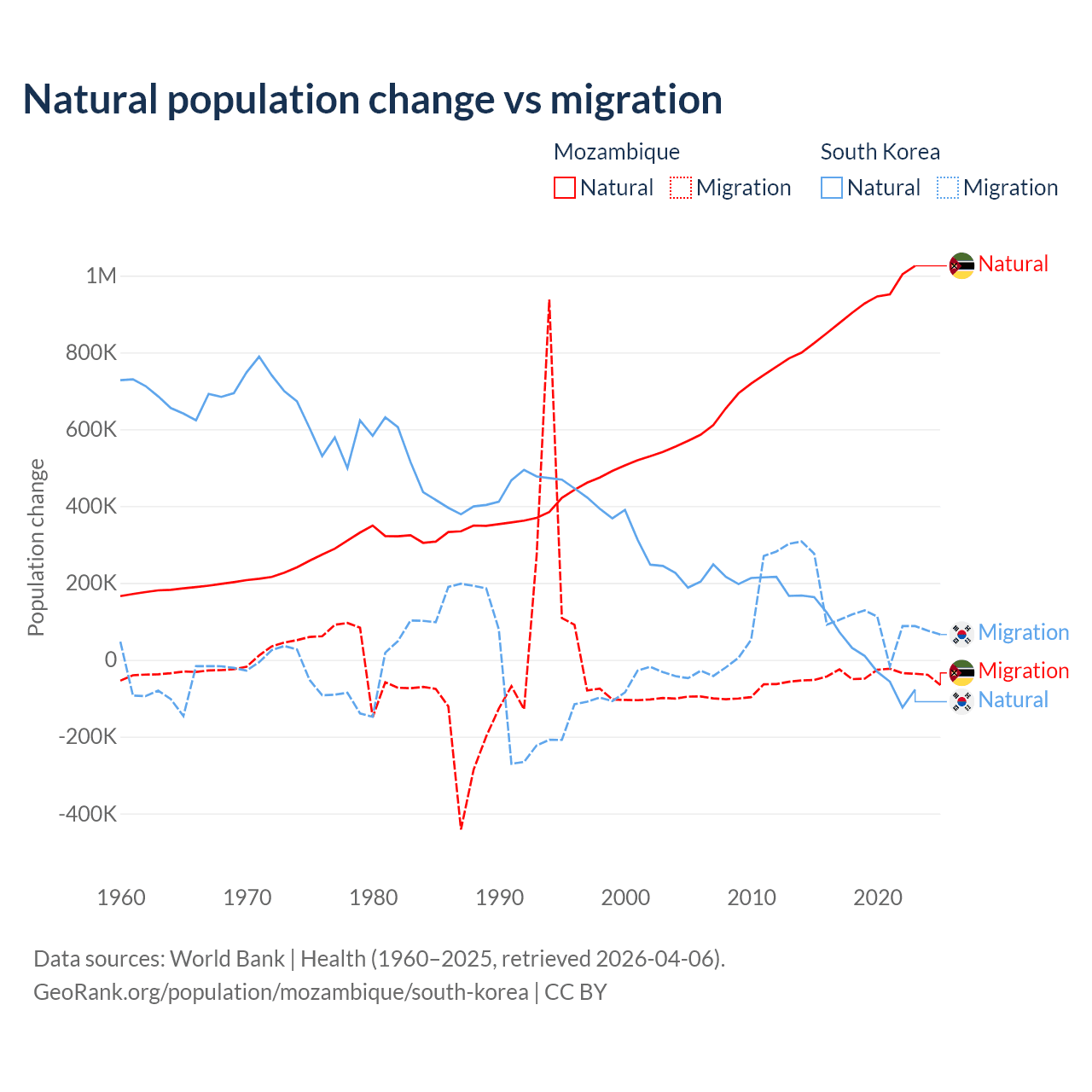 Over the last 10 years, 95.9% of the population change in Mozambique is from natural causes (a gain of 9,108,203 people) and 4.15% is from migration (a loss of 393,923 people). In South Korea 17.6% is from natural causes (a gain of 277,215 people) and 82.4% is from migration (a gain of 1,298,356 people).