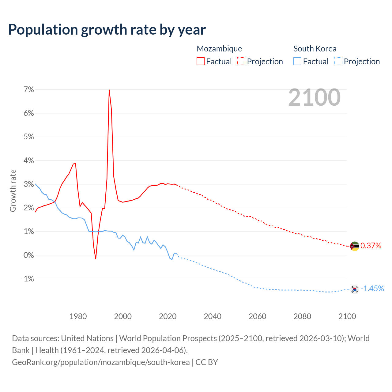 - For the last 10 years, Mozambique has had an average growth rate of +2.99% per year vs +0.24% in South Korea.