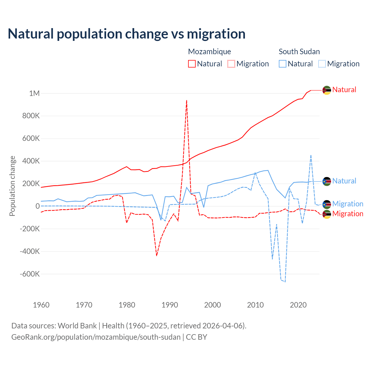 Over the last 10 years, 95.9% of the population change in Mozambique is from natural causes (a gain of 9,108,203 people) and 4.15% is from migration (a loss of 393,923 people). In South Sudan 57.4% is from natural causes (a gain of 1,792,135 people) and 42.6% is from migration (a loss of 1,329,606 people).