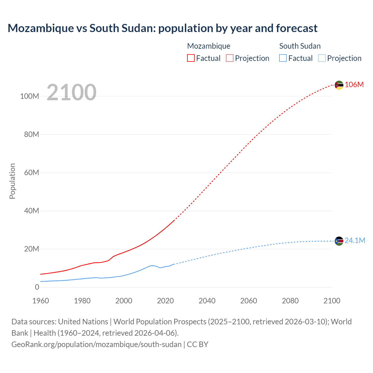 Mozambique vs South Sudan: population by year and forecast