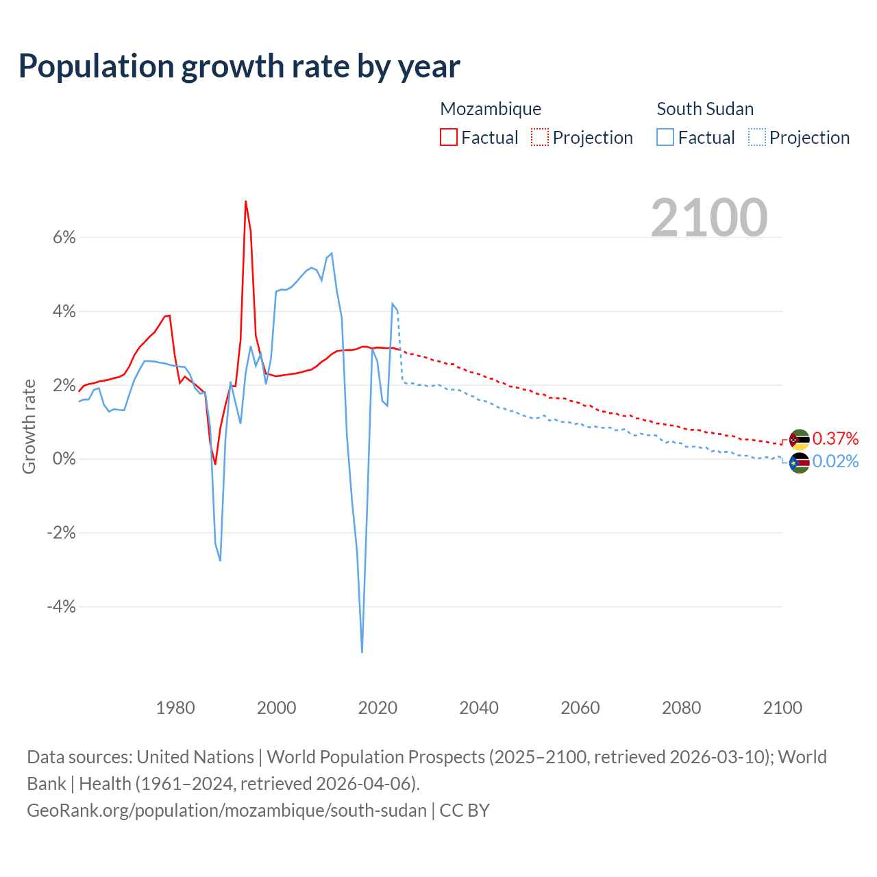 - For the last 10 years, Mozambique has had an average growth rate of +2.99% per year vs +0.65% in South Sudan.