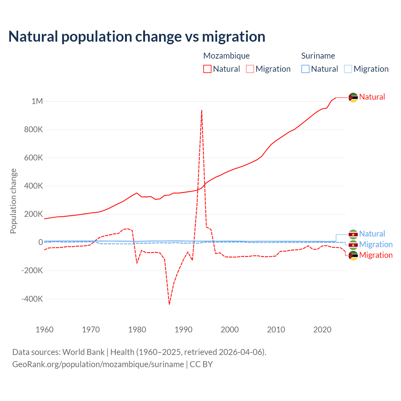Over the last 10 years, 95.9% of the population change in Mozambique is from natural causes (a gain of 9,108,203 people) and 4.15% is from migration (a loss of 393,923 people). In Suriname 90.3% is from natural causes (a gain of 66,709 people) and 9.72% is from migration (a loss of 7,185 people).