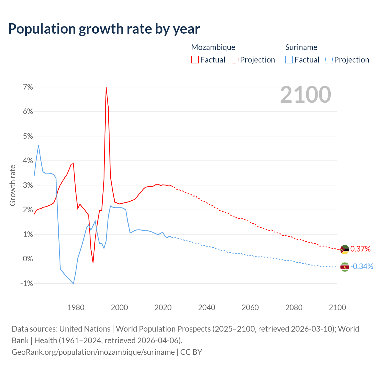 - For the last 10 years, Mozambique has had an average growth rate of +2.99% per year vs +0.99% in Suriname.