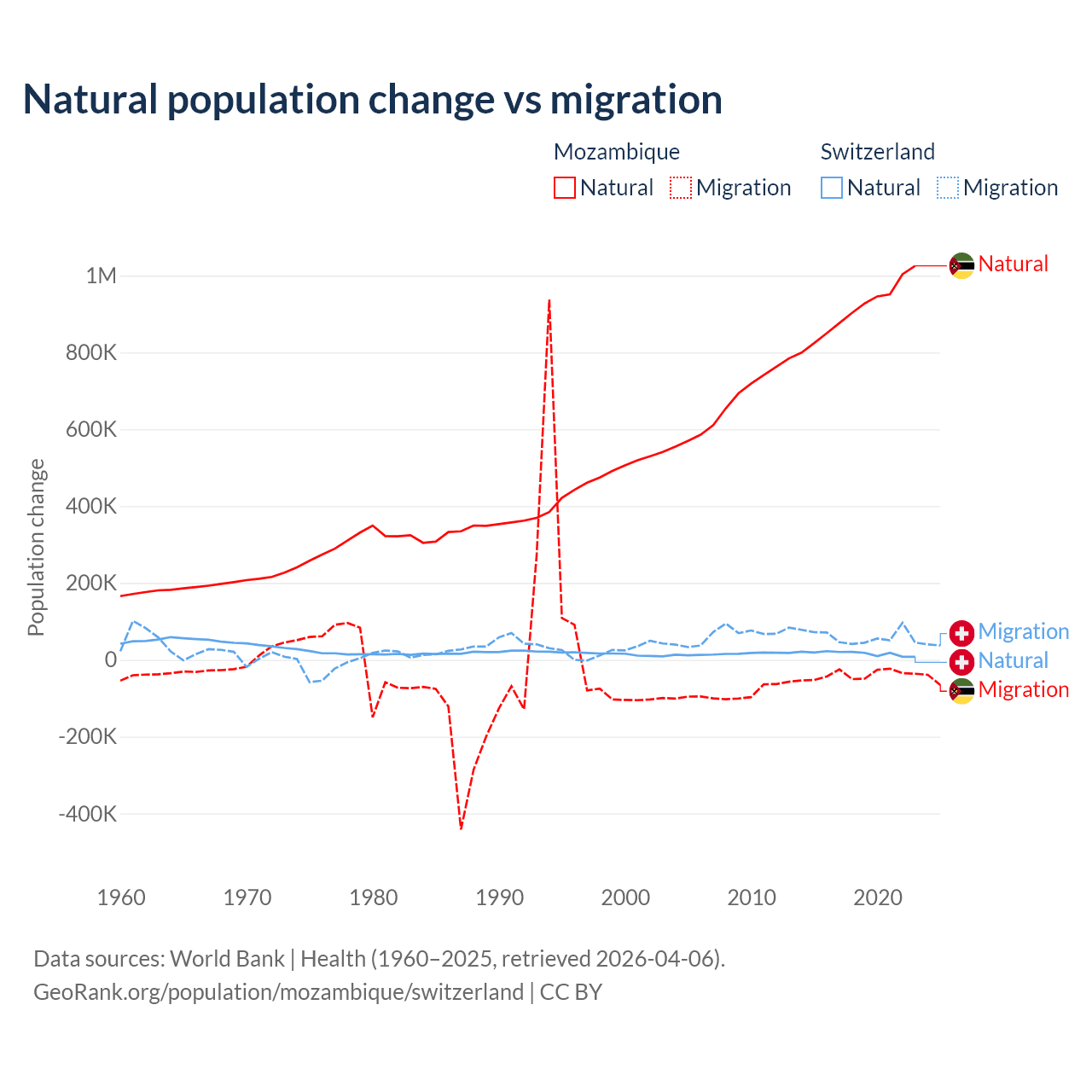 Over the last 10 years, 95.9% of the population change in Mozambique is from natural causes (a gain of 9,108,203 people) and 4.15% is from migration (a loss of 393,923 people). In Switzerland 21.6% is from natural causes (a gain of 165,354 people) and 78.4% is from migration (a gain of 600,145 people).