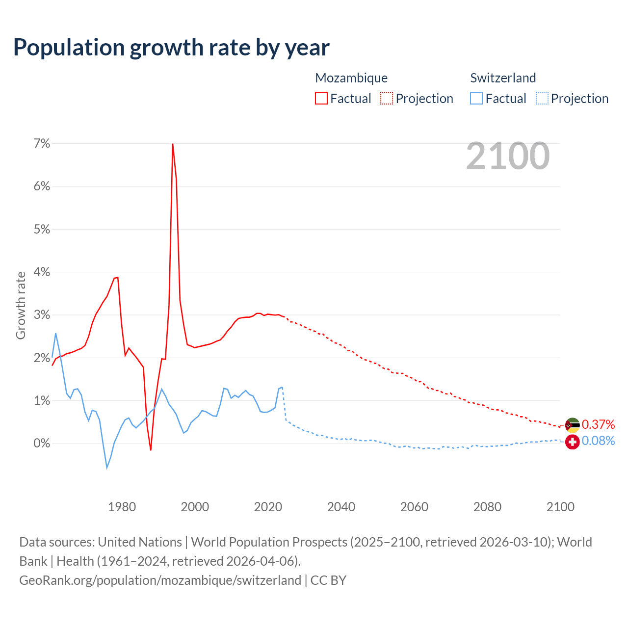 - For the last 10 years, Mozambique has had an average growth rate of +2.99% per year vs +0.98% in Switzerland.