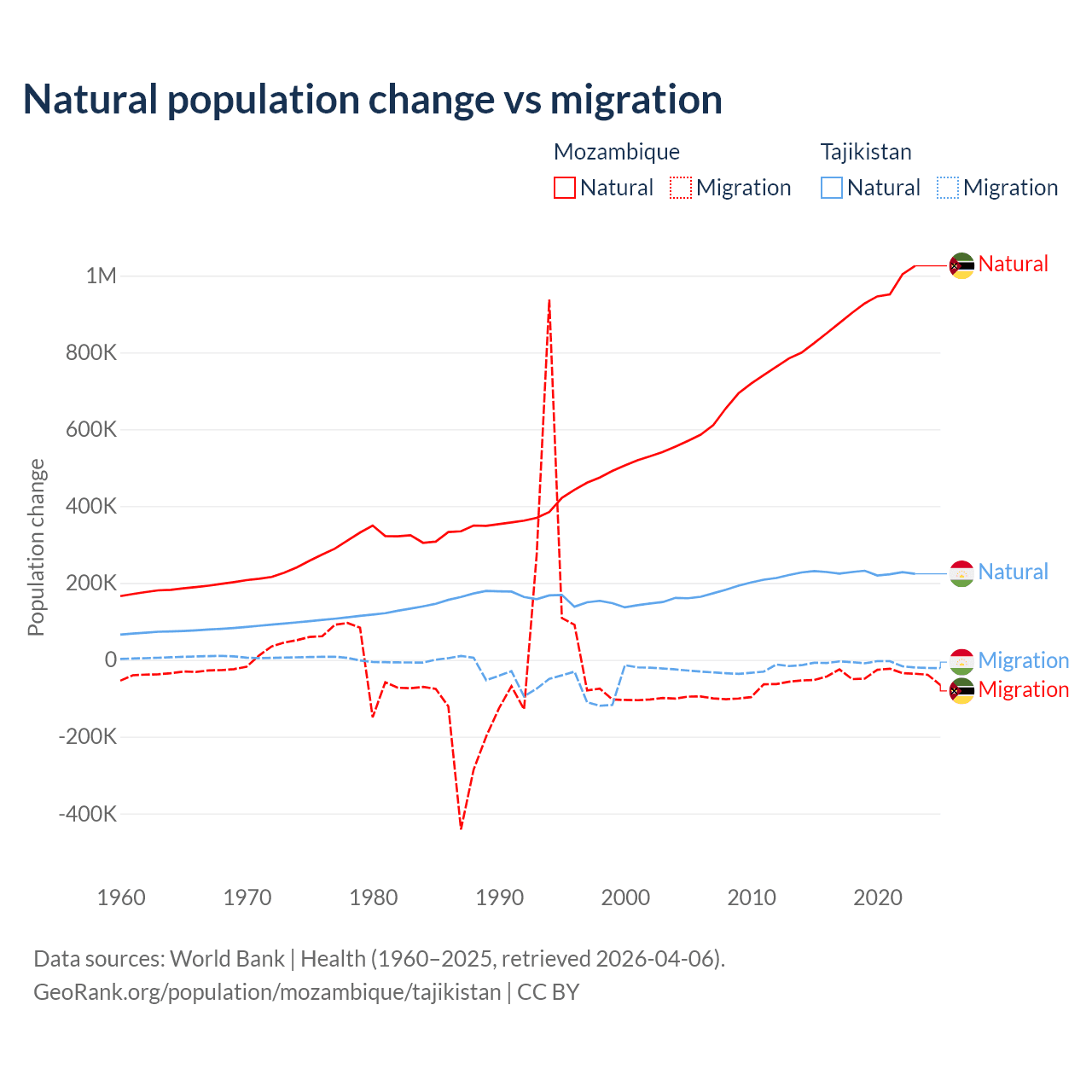 Over the last 10 years, 95.9% of the population change in Mozambique is from natural causes (a gain of 9,108,203 people) and 4.15% is from migration (a loss of 393,923 people). In Tajikistan 96% is from natural causes (a gain of 2,266,045 people) and 3.95% is from migration (a loss of 93,205 people).