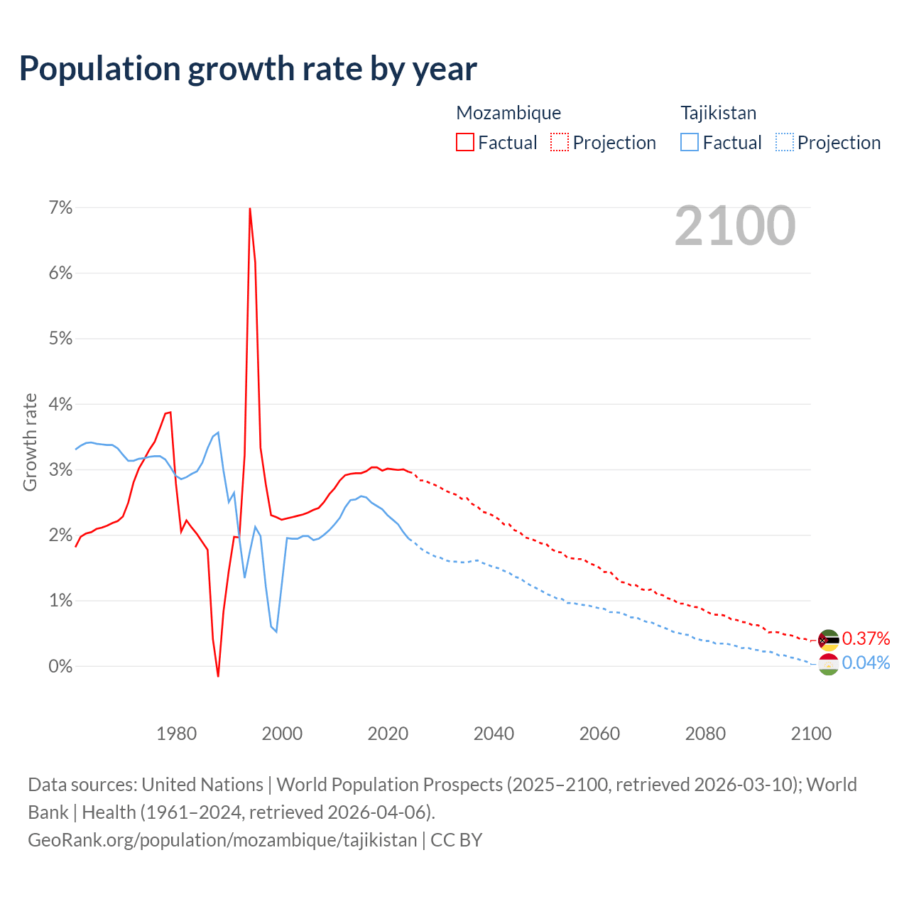 Data sources: World Bank | Health (1960–2024, retrieved 2026-04-06); United Nations | World Population Prospects (1960–2026, retrieved 2026-03-10); U.S. Census Bureau (1960–2025, retrieved 2026-02-08); Central Intelligence Agency (CIA) (2000–2019, retrieved 2026-02-20).