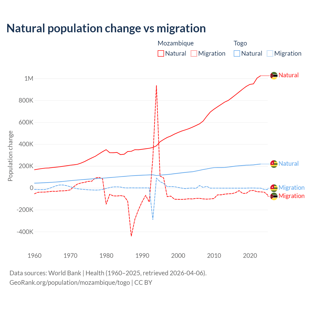 Over the last 10 years, 95.9% of the population change in Mozambique is from natural causes (a gain of 9,108,203 people) and 4.15% is from migration (a loss of 393,923 people). In Togo 99.1% is from natural causes (a gain of 2,052,115 people) and 0.86% is from migration (a loss of 17,852 people).