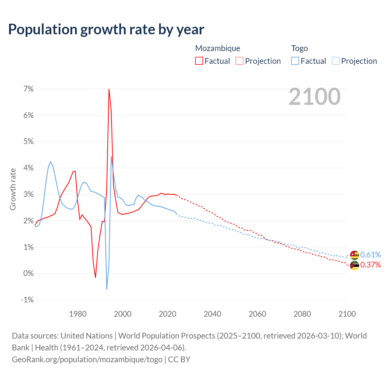 - For the last 10 years, Mozambique has had an average growth rate of +2.99% per year vs +2.46% in Togo.