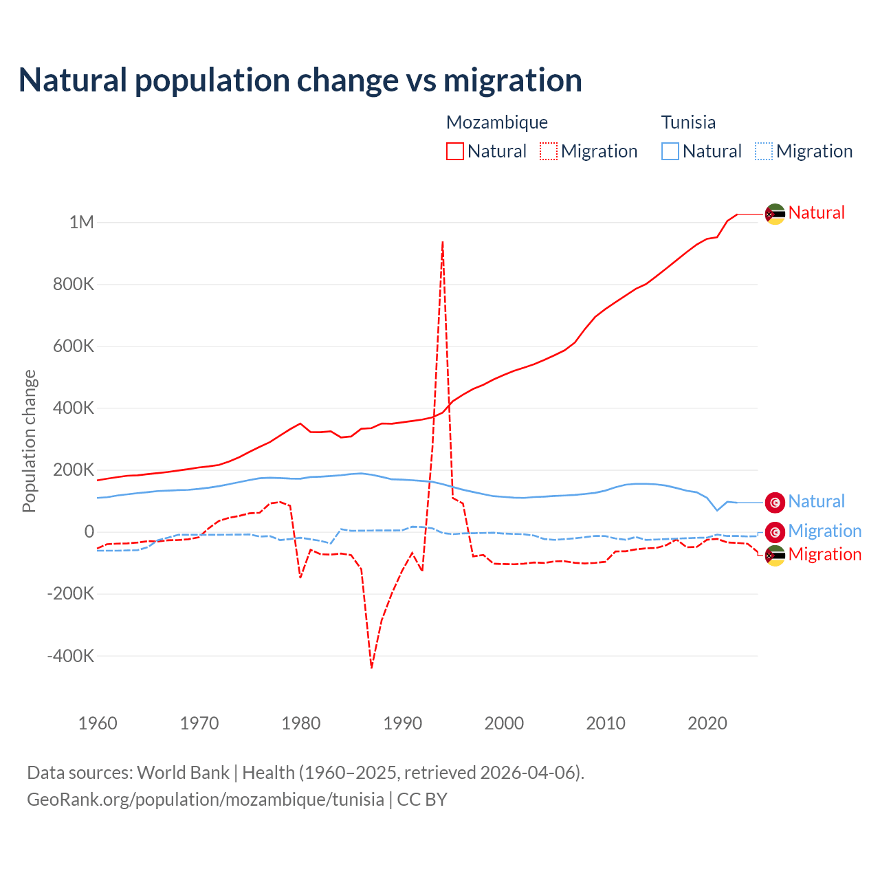 Over the last 10 years, 95.9% of the population change in Mozambique is from natural causes (a gain of 9,108,203 people) and 4.15% is from migration (a loss of 393,923 people). In Tunisia 86.3% is from natural causes (a gain of 1,225,079 people) and 13.7% is from migration (a loss of 195,011 people).