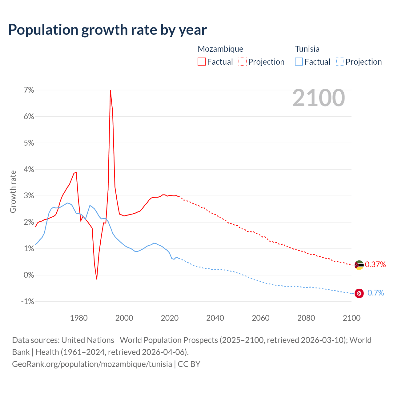 - For the last 10 years, Mozambique has had an average growth rate of +2.99% per year vs +0.89% in Tunisia.