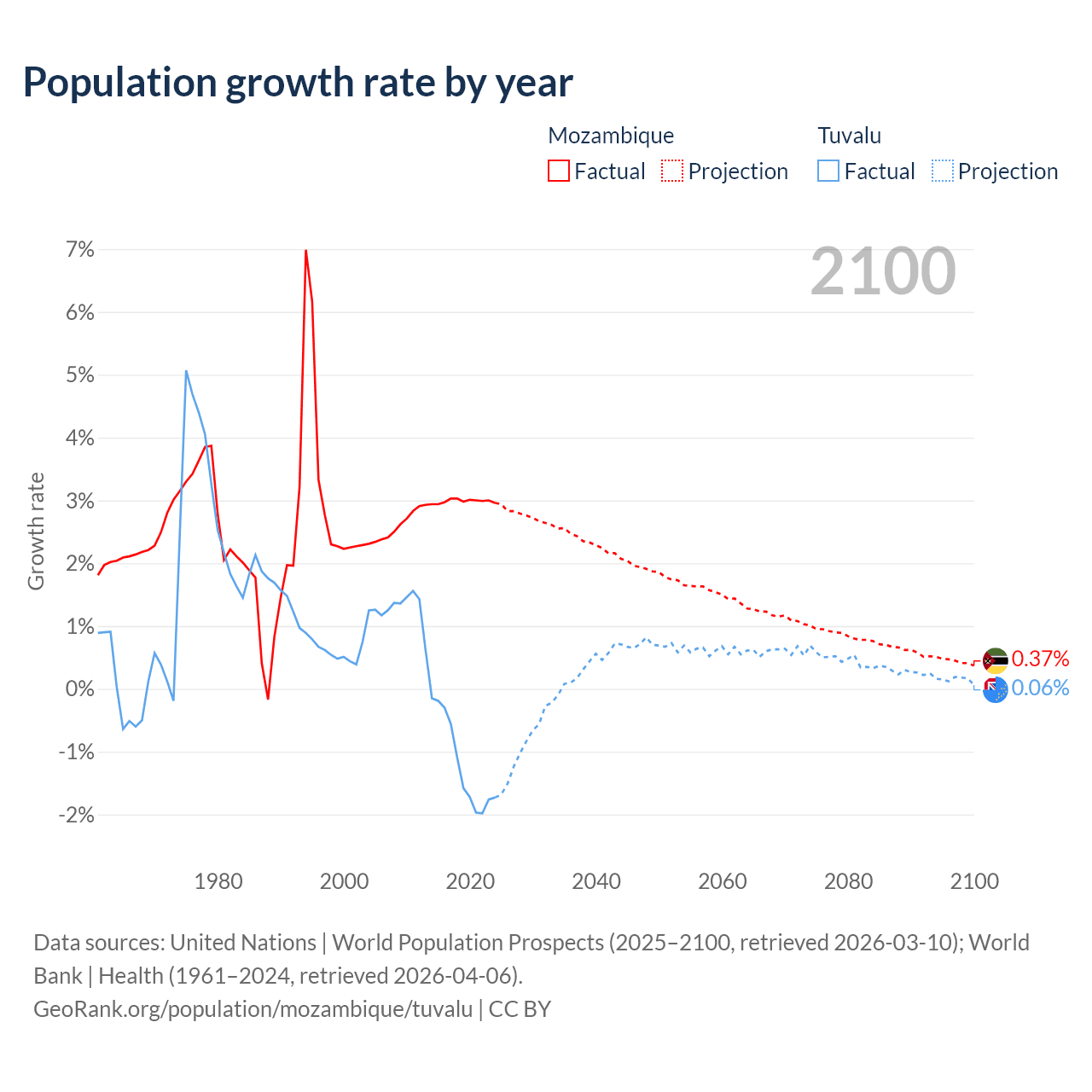 - For the last 10 years, Mozambique has had an average growth rate of +2.99% per year vs -1.19% in Tuvalu.