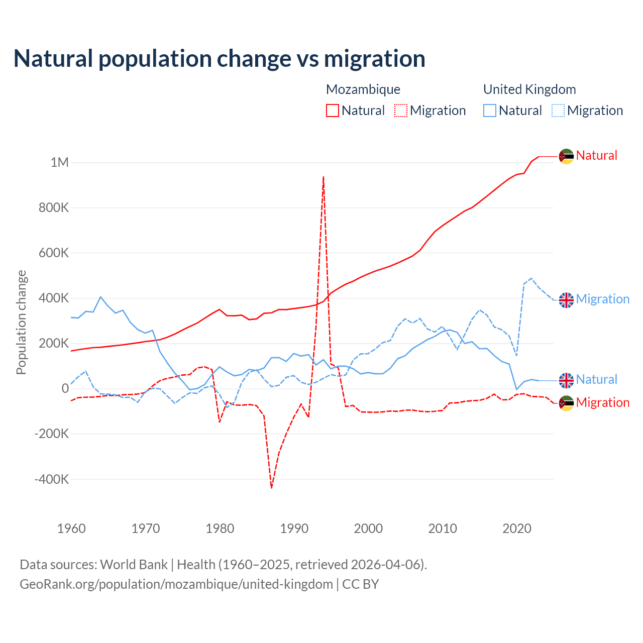 Over the last 10 years, 95.9% of the population change in Mozambique is from natural causes (a gain of 9,108,203 people) and 4.15% is from migration (a loss of 393,923 people). In the United Kingdom 23.9% is from natural causes (a gain of 1,033,129 people) and 76.1% is from migration (a gain of 3,283,101 people).