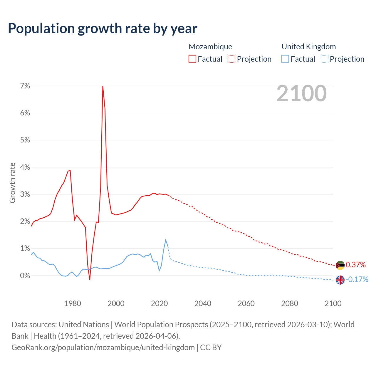 - For the last 10 years, Mozambique has had an average growth rate of +2.99% per year vs +0.7% in the United Kingdom.
