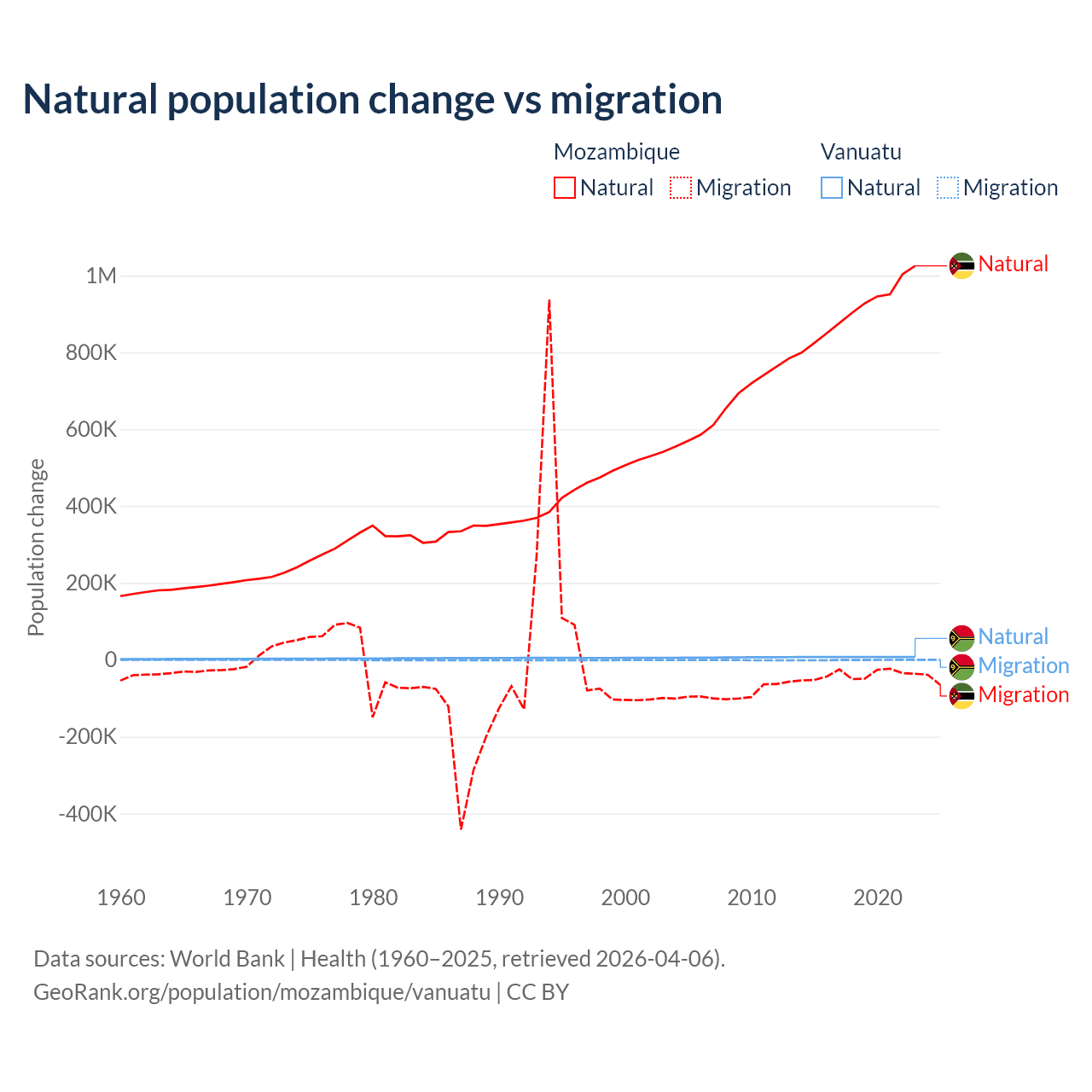 Over the last 10 years, 95.9% of the population change in Mozambique is from natural causes (a gain of 9,108,203 people) and 4.15% is from migration (a loss of 393,923 people). In Vanuatu 92.2% is from natural causes (a gain of 72,941 people) and 7.81% is from migration (a loss of 6,181 people).
