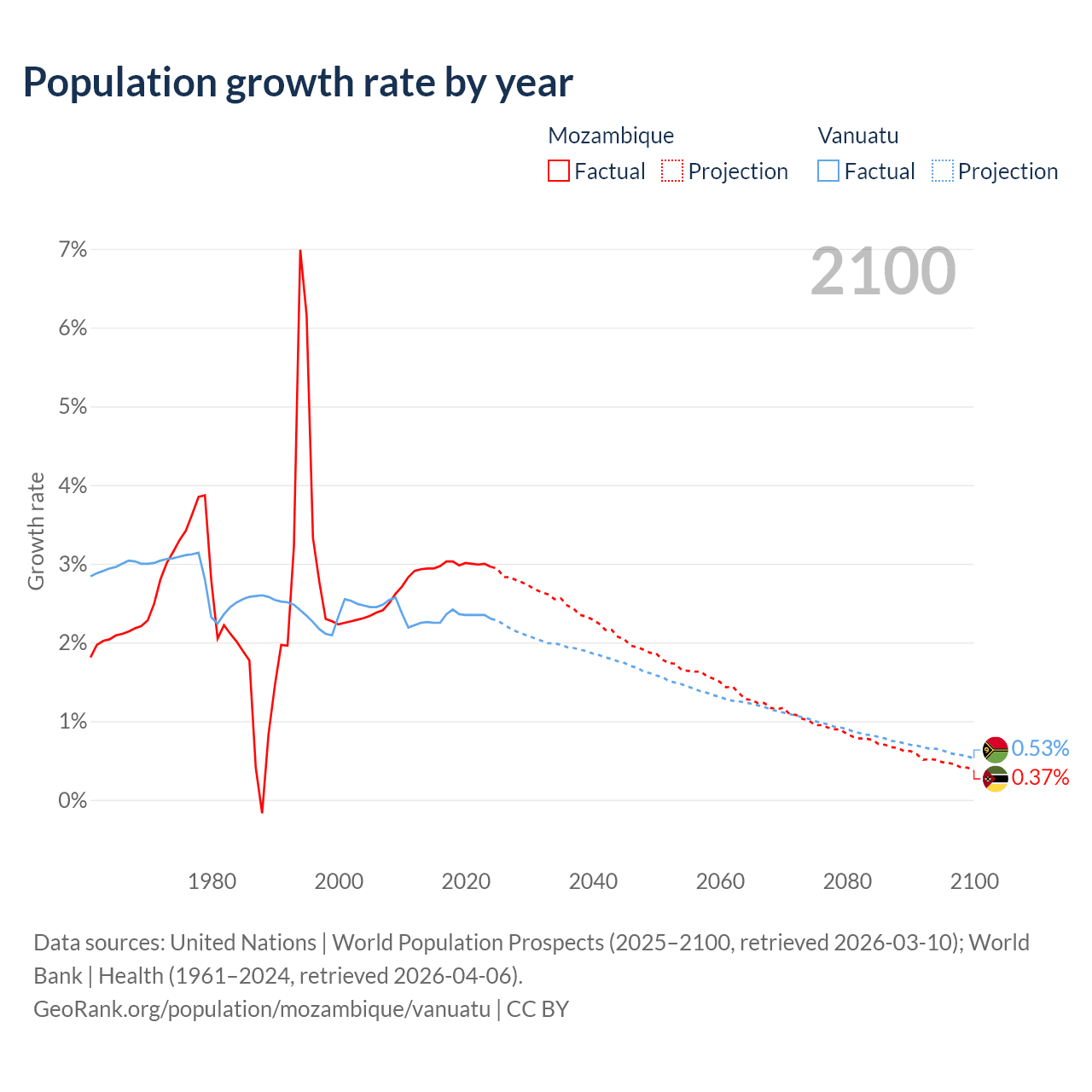 - For the last 10 years, Mozambique has had an average growth rate of +2.99% per year vs +2.33% in Vanuatu.