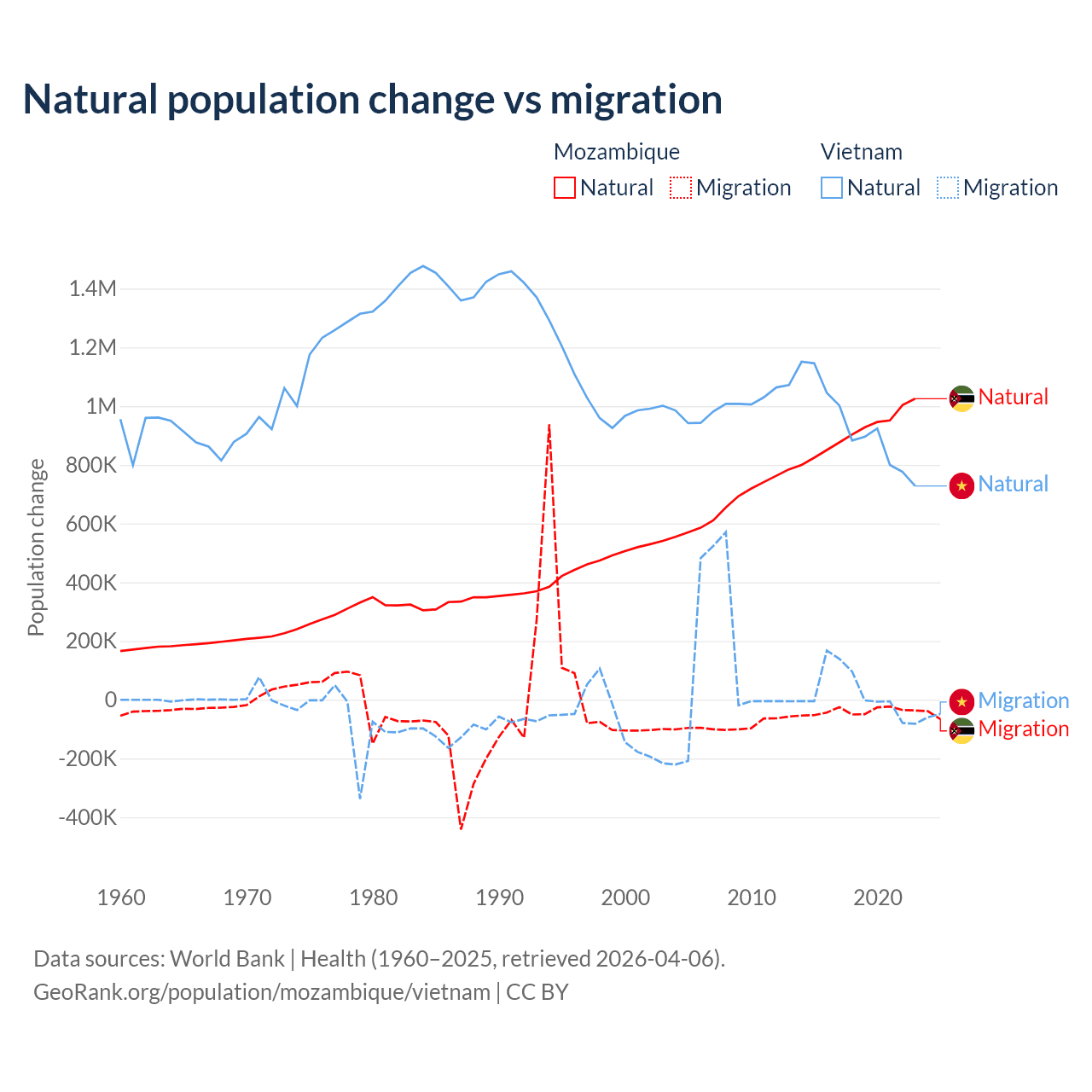 Over the last 10 years, 95.9% of the population change in Mozambique is from natural causes (a gain of 9,108,203 people) and 4.15% is from migration (a loss of 393,923 people). In Vietnam 97.7% is from natural causes (a gain of 9,349,756 people) and 2.29% is from migration (a gain of 219,073 people).