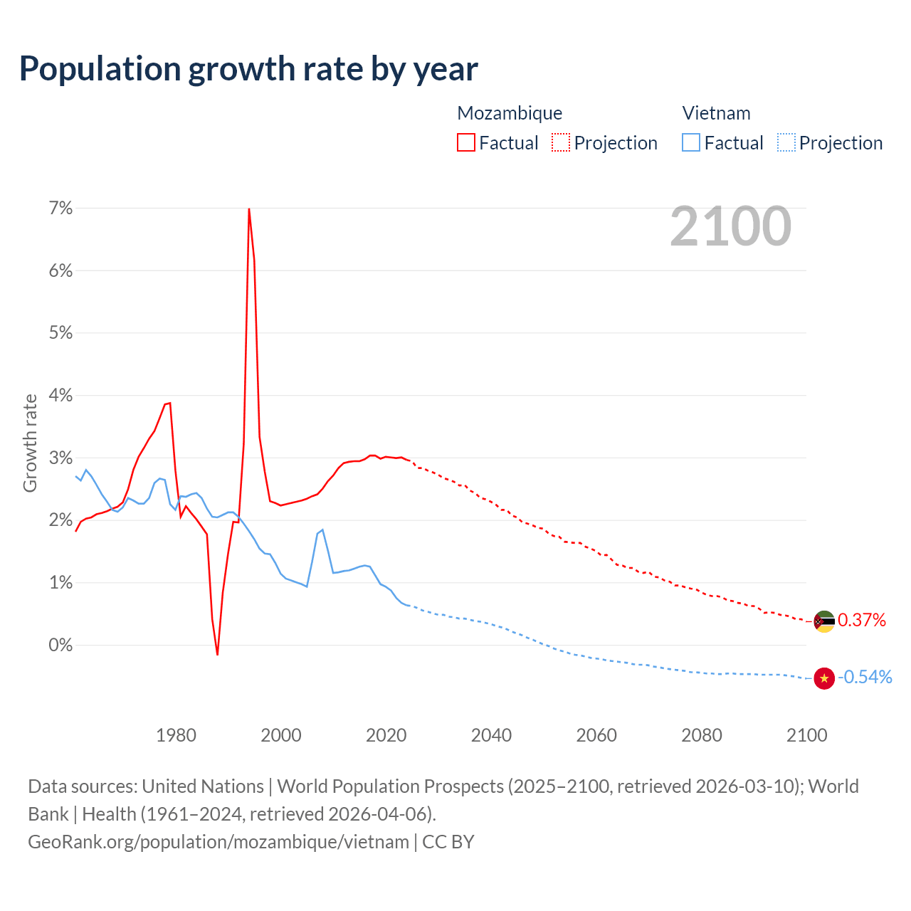- For the last 10 years, Mozambique has had an average growth rate of +2.99% per year vs +0.99% in Vietnam.