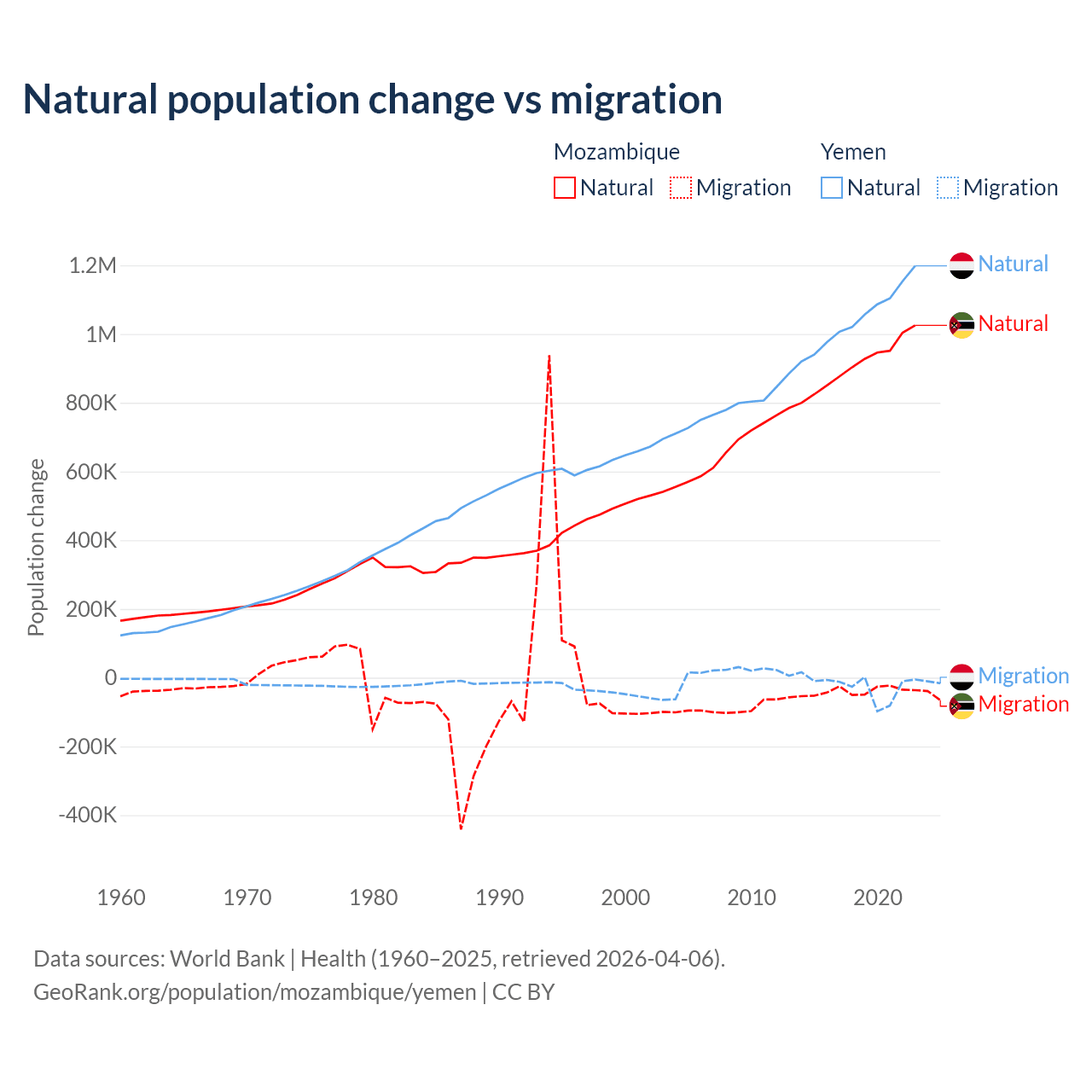Over the last 10 years, 95.9% of the population change in Mozambique is from natural causes (a gain of 9,108,203 people) and 4.15% is from migration (a loss of 393,923 people). In Yemen 97.8% is from natural causes (a gain of 10,460,813 people) and 2.17% is from migration (a loss of 231,814 people).