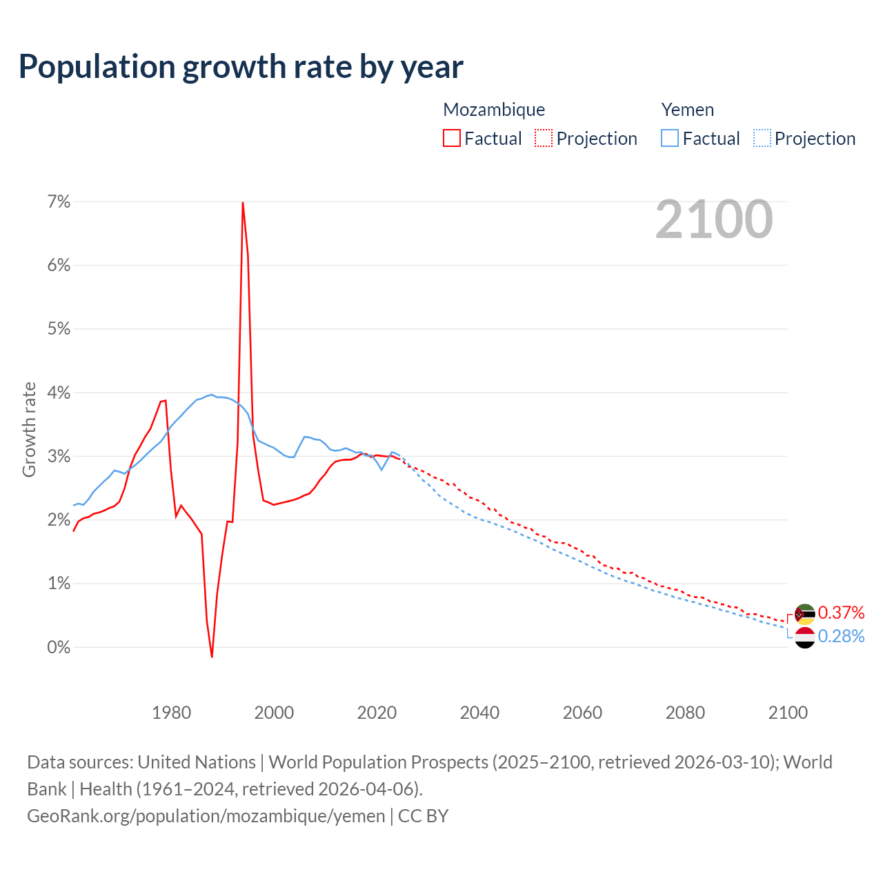 - For the last 10 years, Mozambique has had an average growth rate of +2.99% per year vs +3% in Yemen.