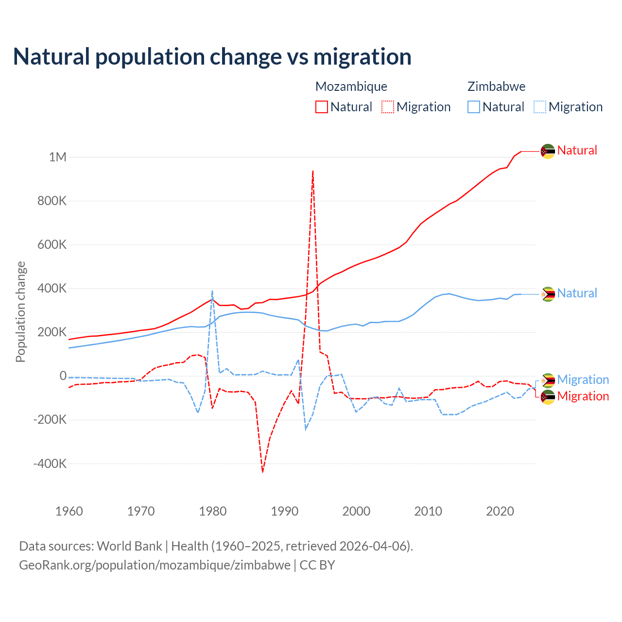 Over the last 10 years, 95.9% of the population change in Mozambique is from natural causes (a gain of 9,108,203 people) and 4.15% is from migration (a loss of 393,923 people). In Zimbabwe 74.9% is from natural causes (a gain of 3,558,487 people) and 25.1% is from migration (a loss of 1,192,807 people).