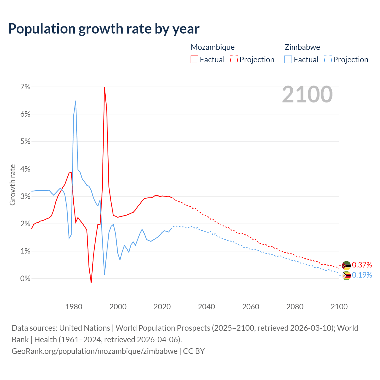 - For the last 10 years, Mozambique has had an average growth rate of +2.99% per year vs +1.57% in Zimbabwe.