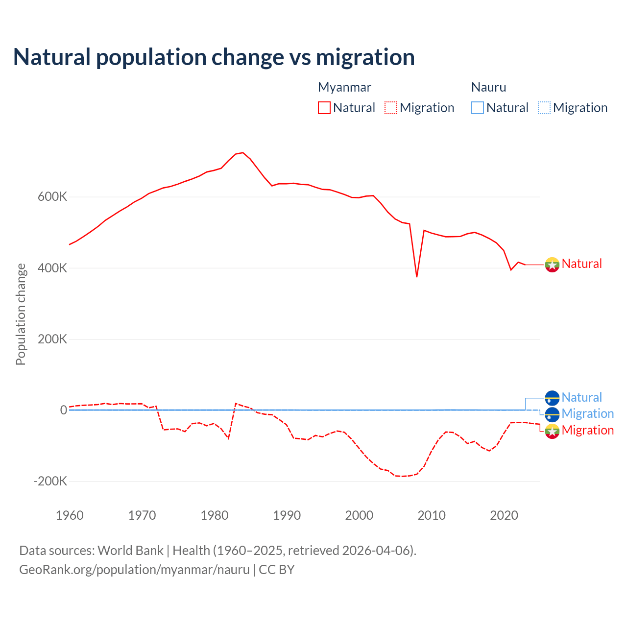 Over the last 10 years, 86% of the population change in Myanmar is from natural causes (a gain of 4,594,615 people) and 14% is from migration (a loss of 749,272 people). In Nauru 66.2% is from natural causes (a gain of 2,590 people) and 33.8% is from migration (a loss of 1,320 people).