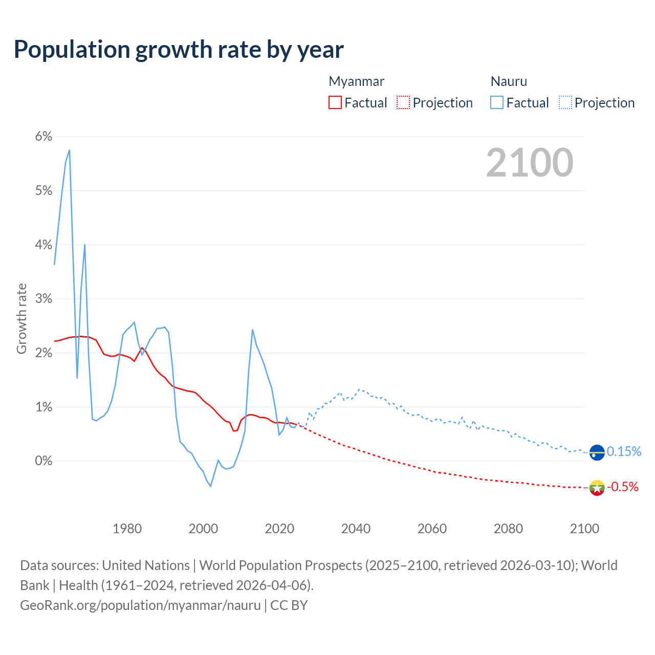 - For the last 10 years, Myanmar has had an average growth rate of +0.74% per year vs +1.17% in Nauru.
