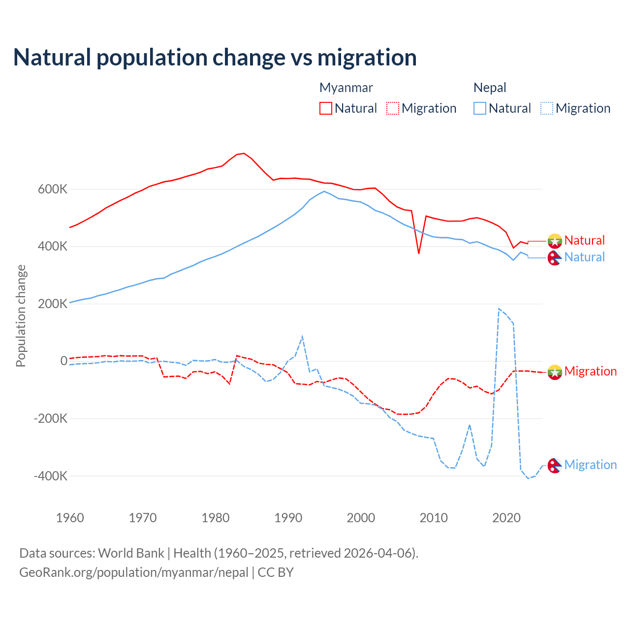 Over the last 10 years, 86% of the population change in Myanmar is from natural causes (a gain of 4,594,615 people) and 14% is from migration (a loss of 749,272 people). In Nepal 67.9% is from natural causes (a gain of 3,909,749 people) and 32.1% is from migration (a loss of 1,851,664 people).