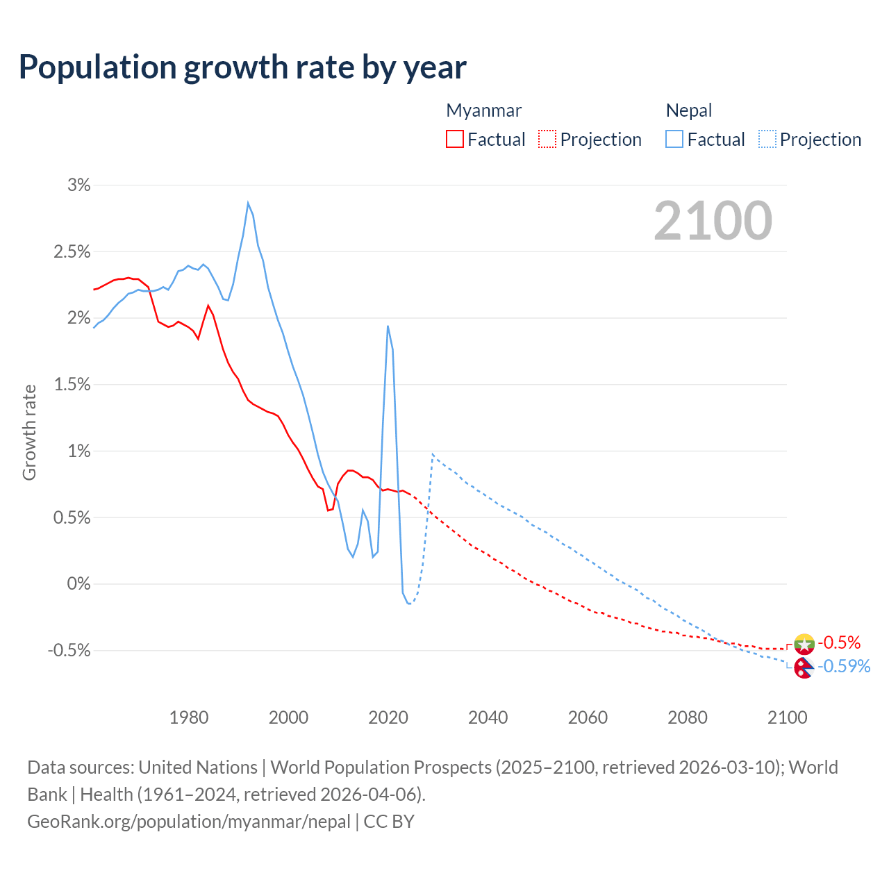 - For the last 10 years, Myanmar has had an average growth rate of +0.74% per year vs +0.66% in Nepal.