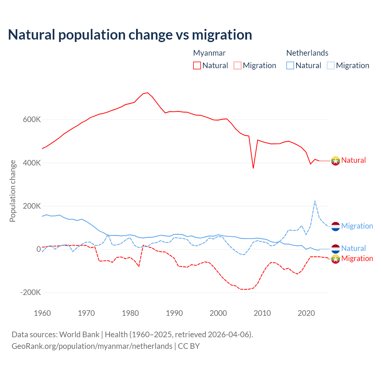 Over the last 10 years, 86% of the population change in Myanmar is from natural causes (a gain of 4,594,615 people) and 14% is from migration (a loss of 749,272 people). In the Netherlands 11.8% is from natural causes (a gain of 134,554 people) and 88.2% is from migration (a gain of 1,006,495 people).
