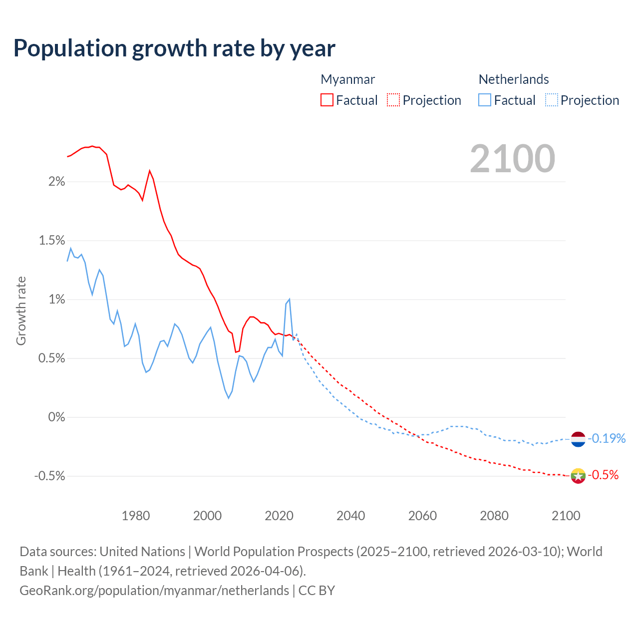- For the last 10 years, Myanmar has had an average growth rate of +0.74% per year vs +0.62% in the Netherlands.