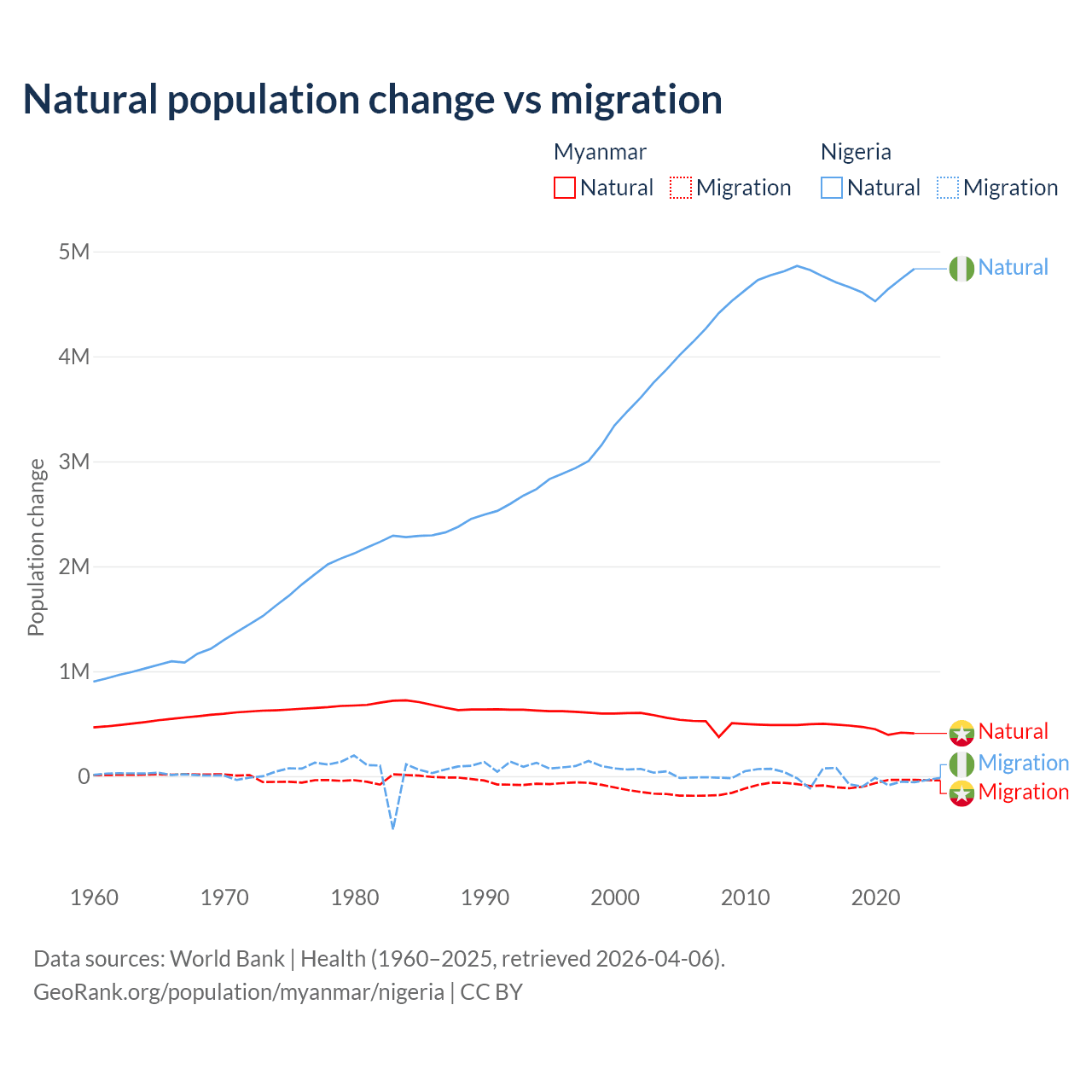 Over the last 10 years, 86% of the population change in Myanmar is from natural causes (a gain of 4,594,615 people) and 14% is from migration (a loss of 749,272 people). In Nigeria 99.2% is from natural causes (a gain of 47,163,517 people) and 0.77% is from migration (a loss of 368,103 people).