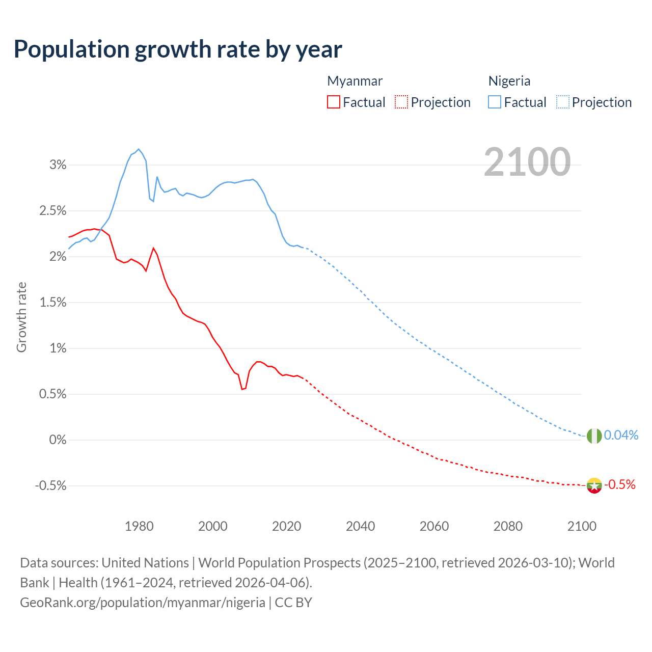 - For the last 10 years, Myanmar has had an average growth rate of +0.74% per year vs +2.31% in Nigeria.