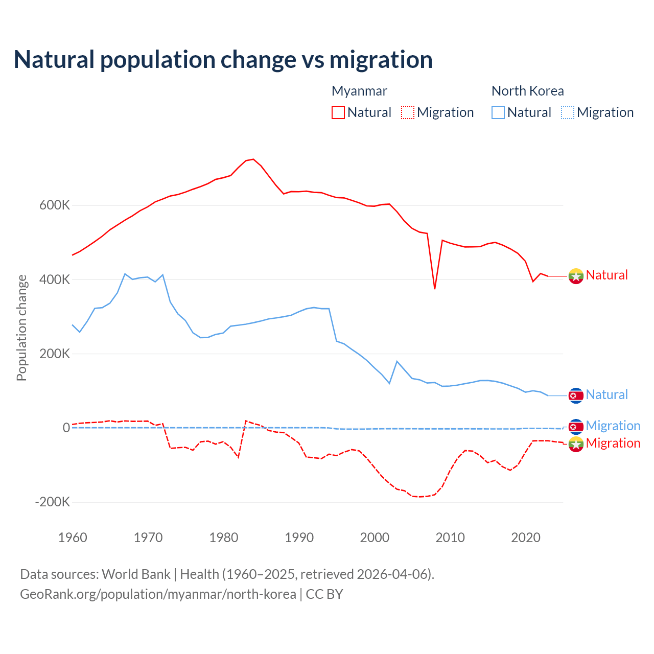 Over the last 10 years, 86% of the population change in Myanmar is from natural causes (a gain of 4,594,615 people) and 14% is from migration (a loss of 749,272 people). In North Korea 97.7% is from natural causes (a gain of 1,097,372 people) and 2.33% is from migration (a loss of 26,227 people).