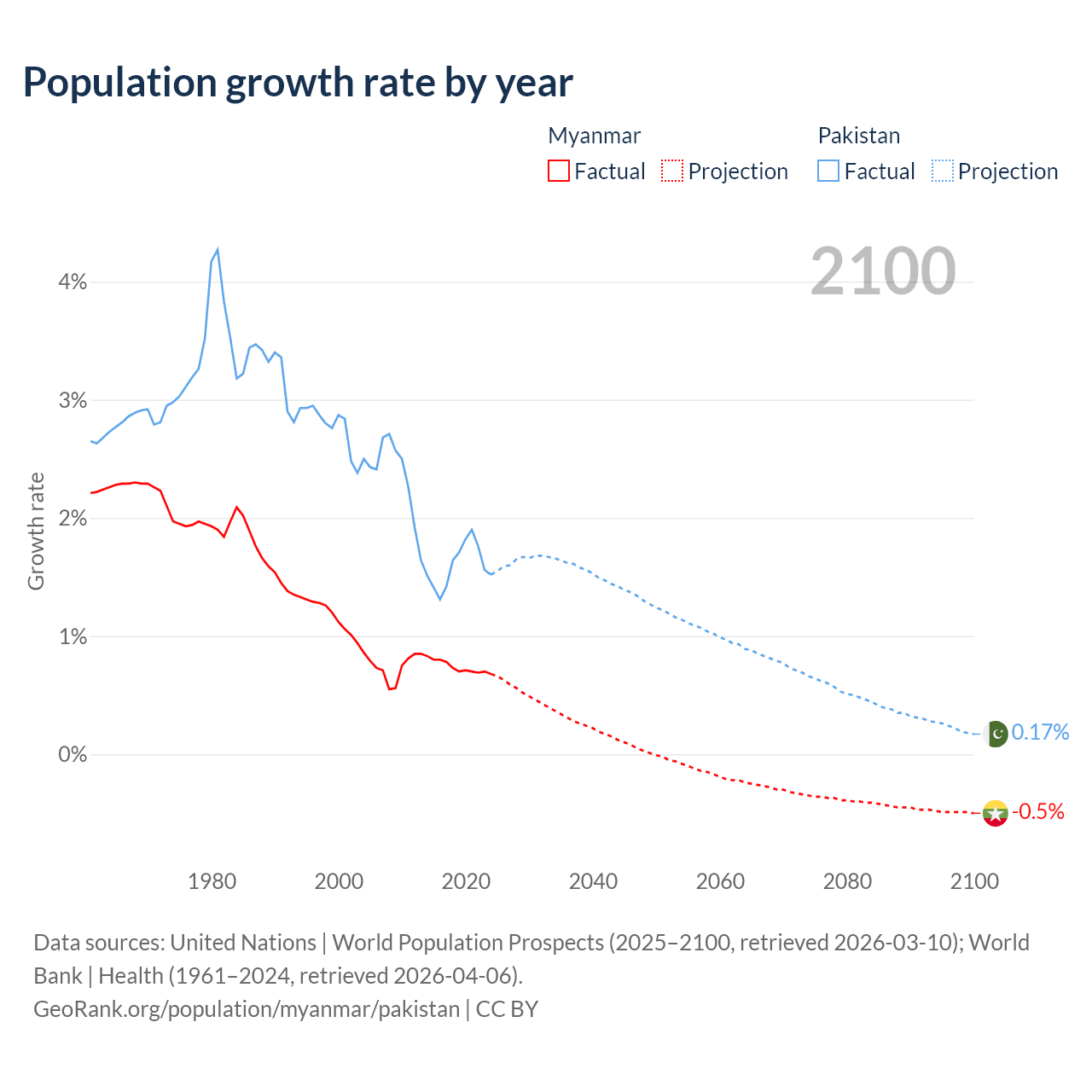 - For the last 10 years, Myanmar has had an average growth rate of +0.74% per year vs +1.6% in Pakistan.