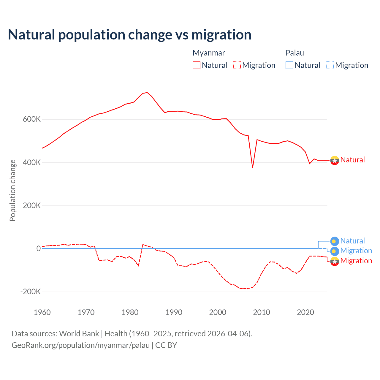 Over the last 10 years, 86% of the population change in Myanmar is from natural causes (a gain of 4,594,615 people) and 14% is from migration (a loss of 749,272 people). In Palau 53.8% is from natural causes (a gain of 264 people) and 46.2% is from migration (a loss of 227 people).
