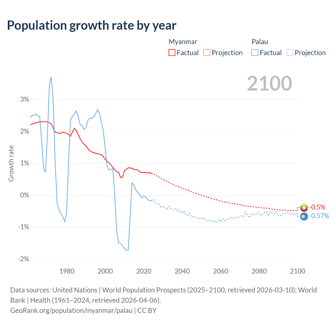 - For the last 10 years, Myanmar has had an average growth rate of +0.74% per year vs +0.02% in Palau.