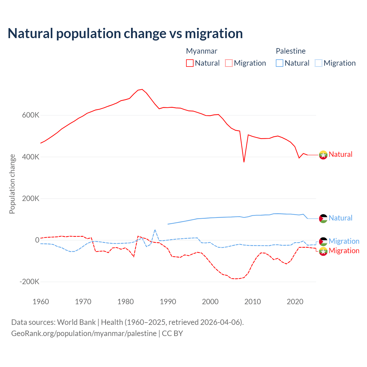 Over the last 10 years, 86% of the population change in Myanmar is from natural causes (a gain of 4,594,615 people) and 14% is from migration (a loss of 749,272 people). In Palestine 85.7% is from natural causes (a gain of 1,218,010 people) and 14.3% is from migration (a loss of 202,820 people).