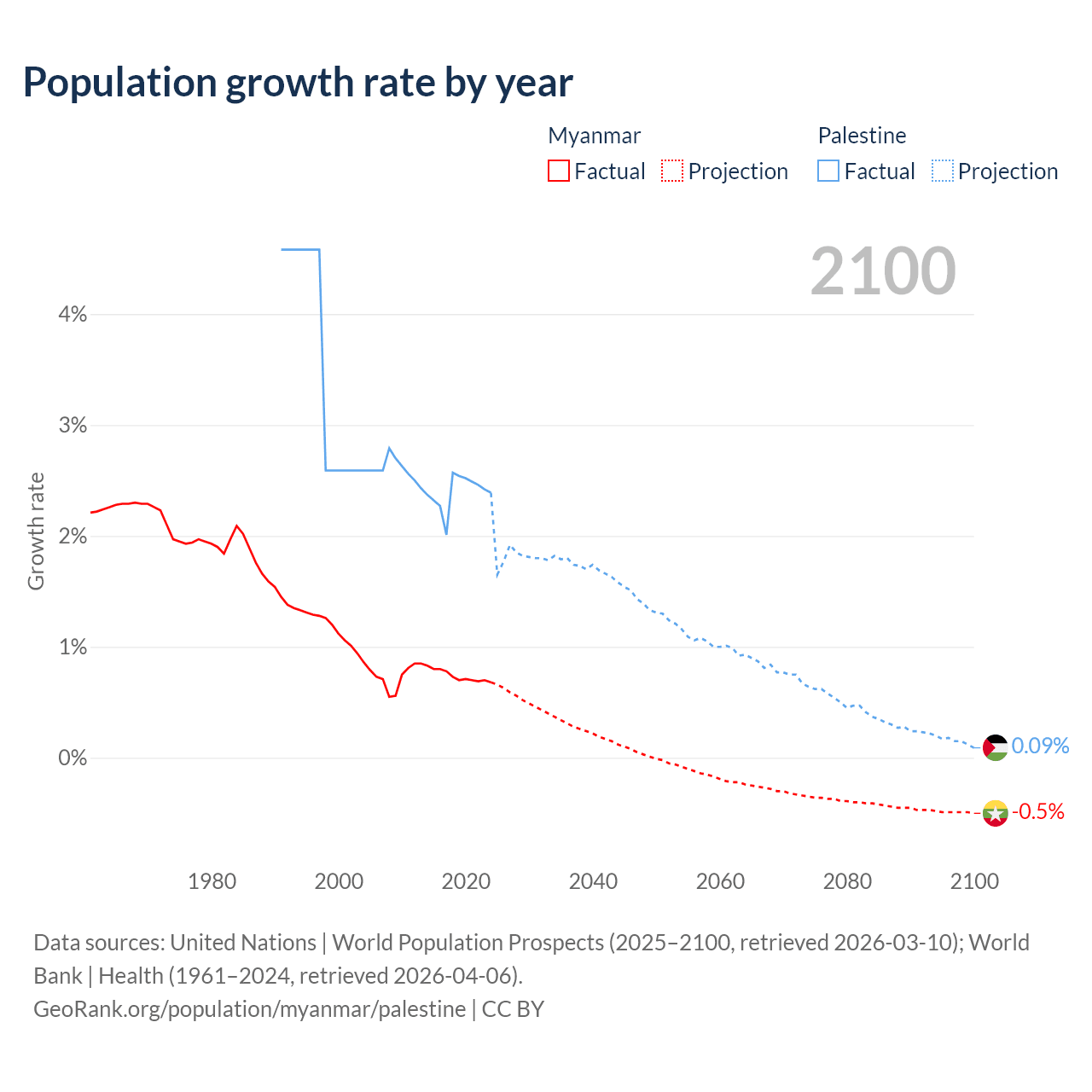 - For the last 10 years, Myanmar has had an average growth rate of +0.74% per year vs +2.4% in Palestine.